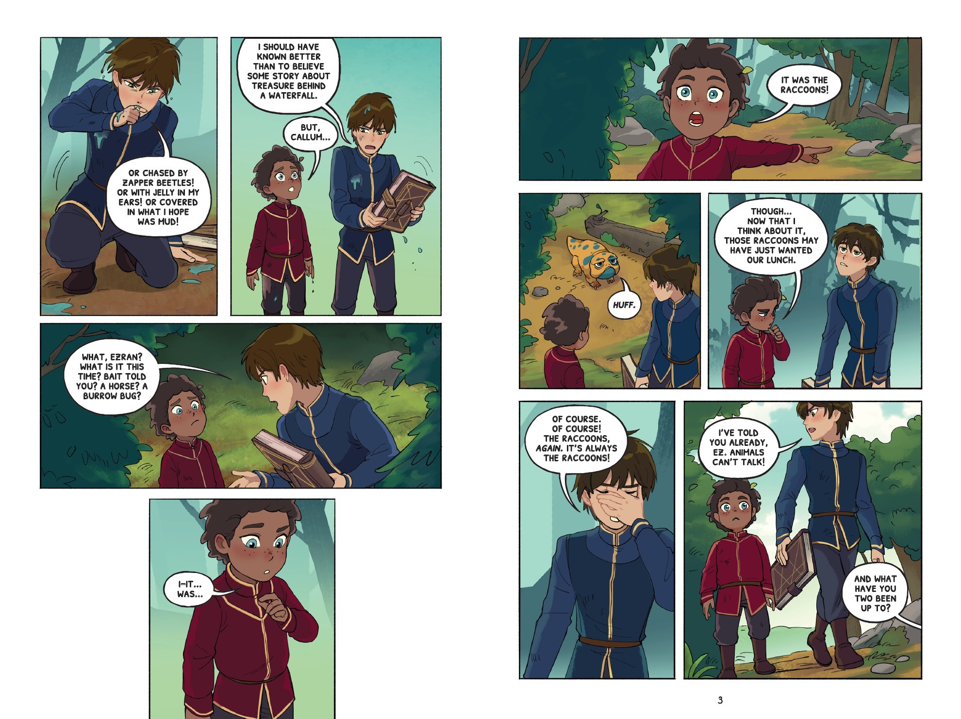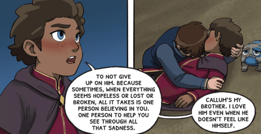 As Franchise Lead at Wonderstorm, I focused on expanding the narrative universe of The Dragon Prince through stories that deepen its characters and mythology. When Scholastic approached us about a fourth graphic novel, head writer Devon Giehl and I developed Dreamer’s Nightmare, centering the story on a coming-of-age for our two main brothers prior to the events of the series. Ezran, known in-show for his calm and empathetic way of connecting with practically anyone, overcoming his fears around communicating. And Callum, the big brother, really stepping into his role as protector to his younger step-brother. But the crux of this tale was it taking place in the wake of both boys losing their mom, and ultimately, it was a story about grief.